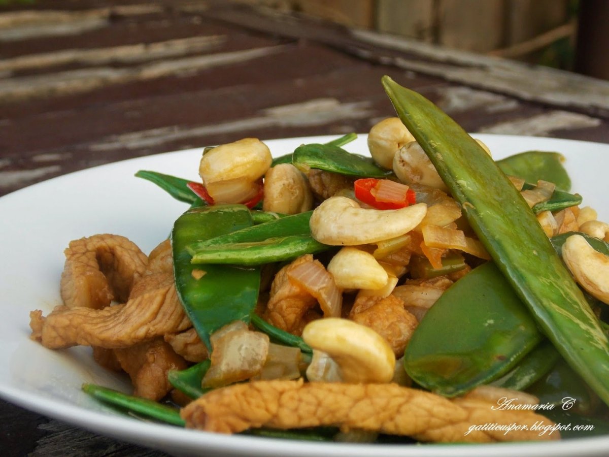 Lasati porcul la marinat pentru 30 de minute apoi prajiti in cei 50 ml de ulei pentru 3-4 minute apoi adaugati mangetout-ul, caju-ul, ceapa si chili-ul tocata marunt si caliti pentru inca 2-3 minute.