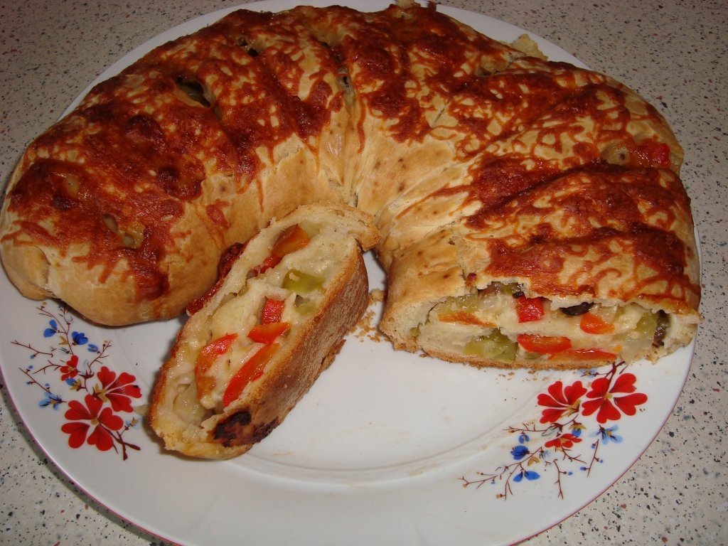 Se tau toate ingredintele marunt sau prin razatoare, se amesteca toate si se intinde peste compozitia de aluat.Faci aluatul sul si il pui intr-o tava unsa, dandu-i forma unei potcoave pe care o crestezi din 2 in 2 cm.