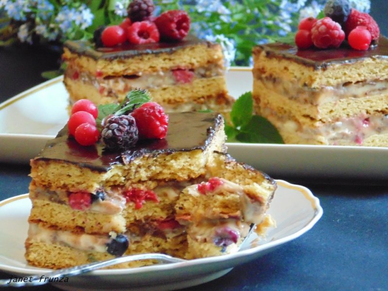 Punem prima foaie de prajitura. Peste vom pune jumatate din crema. Peste crema vom presara jumatate din mixul de fructe de padure. Apoi vom pune a doua foaie,restul de crema si fructe de padure.Terminam cu a treia foaie, peste care vom pune glazura. Glazura ce am facut-o, din frisca lichida si ciocolata. Am pus pe foc mic frisca si ciocolata,cand s-a topit ciocolata,asa fierbinte am turnat-o peste prajitura.