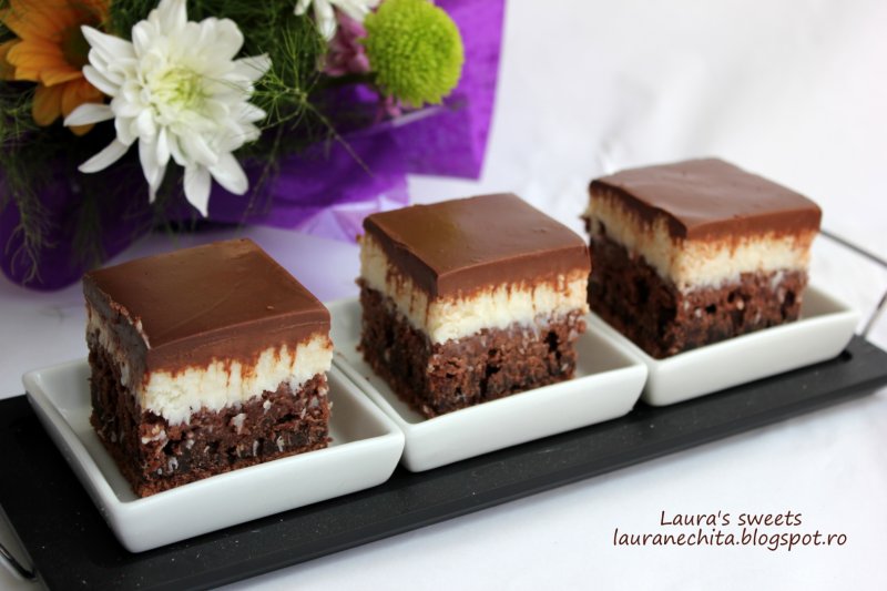 Folosim o tava dreptunghiulara, prevazuta cu hartie de copt si turnam compozitia in ea. Batem usor tava sa se niveleze compozitia si dam la cuptorul preincins, la foc mediu, timp de 30 - 40 minute. Facem proba cu scobitoarea pentru mai multa siguranta!