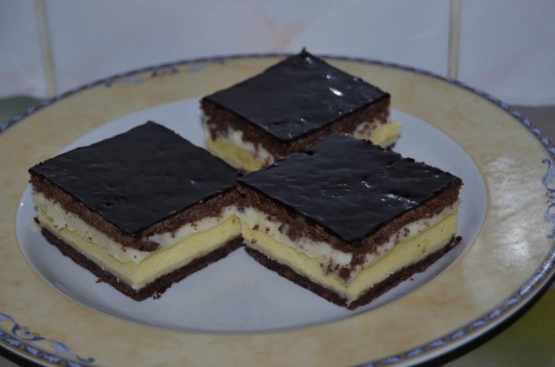 Se pune pe masa de lucru o foaie neagra, peste foaie se toarna usor jumatate din crema, se pune peste crema foaia galbena, se toarna cealalta jumatate de crema si se pune ultima foaie neagra.