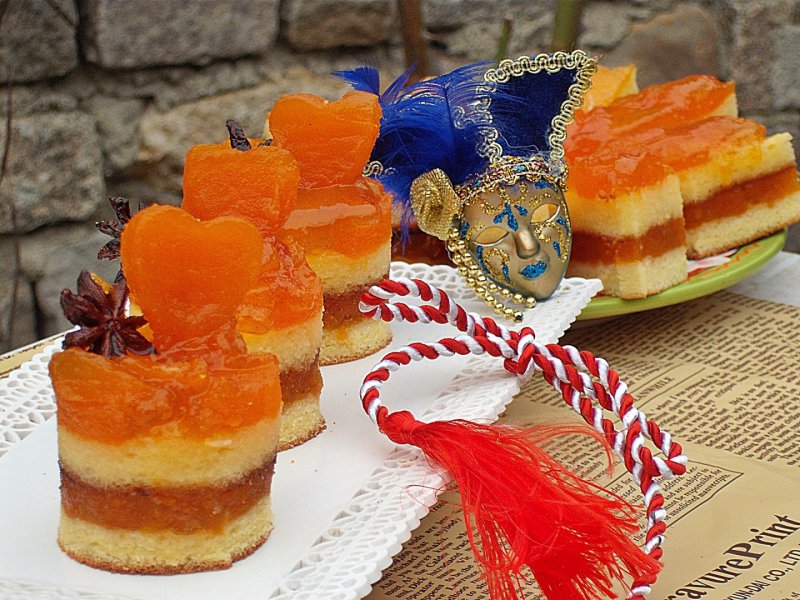 Se aseaza prima jumatate de blat si se toarna deasupra,bucatile fierte de dovleac din care oprim un castronel pentru decor, amesecate cu gelatina hdratata cu 100 ml apap rece si apoi topita la bain marin.Deasupra se aseaza a 2 bucata de blat,se preseaza usor cu mana,pe toata suprafata ,se presara dasupra,pe toata suprafata prajituraii,bucatile de dovleac oprite si se preparara jeleul din sucul ramas in care am dizolvat tort-gelle-ul si apoi am dat totul intr-un clocot.se toarna deasupra prajiturii fierbinte.Se lasa cateva ore la rece dar de preferat de seara pana a 2 a zi,cand se taie prajitura.