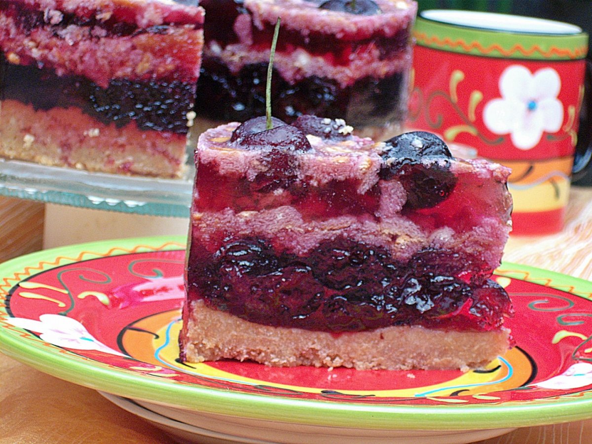 In jumatate din cantitatea de sirop se adaug gelatina hidratata in 100 ml apa rece si apoi topita la bain marin.Turnam acest sirop peste blatul de biscuiti, presaram ciresele scurse pe toata suprafata si dam la rece inca 30 de minute.