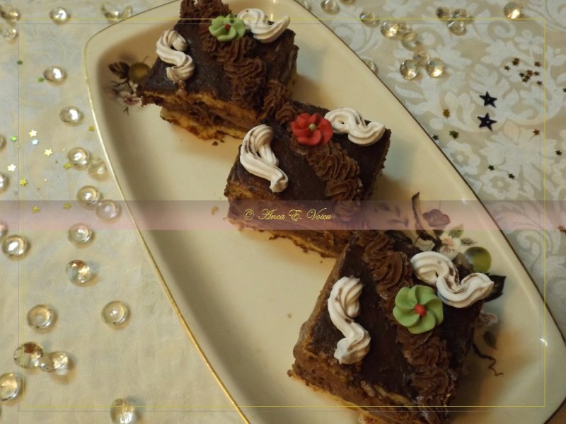 Pentru a asambla: la baza se pune o foaie alba, se insiropeaza (nu prea tare, ci doar o atingere delicata. S-ar putea sa nu aveti nevoie de tot siropul). Se intinde crema de unt, dar nu toata, ci pastram o lingura pentru cateva flori de decor. Se asaza la mijloc foaia de cacao, se adauga a doua crema, iar deasupra vine cealalta foaie alba.