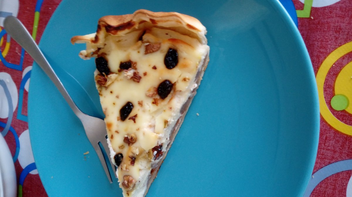 Curatam perele de coaja (perele nu trebuie sa fie foarte coapte), le taiem felii subtiri si le amestecam cu o lingura de zahar, scortisoara si 2-3 picaturi de vanilie. In alt vas amestecam branza ricotta cu 2 linguri de zahar, oul si esenta de vanilie. Intindem foaia de placinta in tava impreuna cu hirtia de copt. Intepam cu furculita din loc in loc, asezam feliile de pere, turnam deasupra crema, presaram simburii de nuca rupti bucatele si stafidele, indoim usor fara sa apasam prea tare marginile foii de placinta si introducem in cuptorul incins.