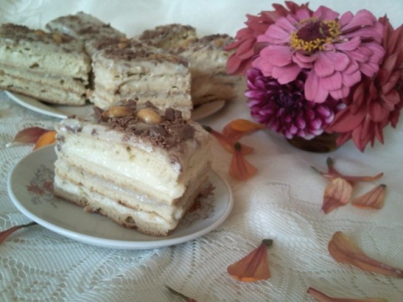 Asezam pe o tava o foaie, o insiropam deasupra cu putin compot de zarzari si adaugam crema de vanilie. Si iarasi foaie -crema capucino-foaie-crema vanilie-foaie si la final adaugam crema de capuccino.