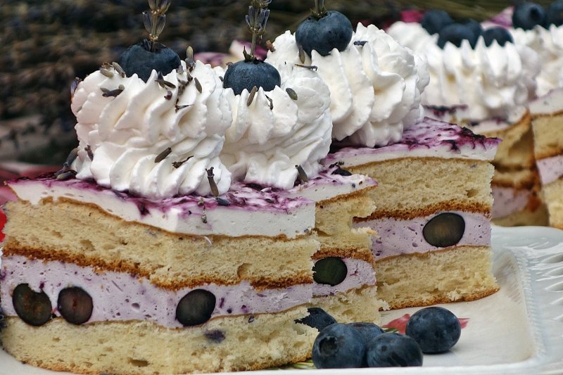 Se mixeaza frisca pana se intareste. Se mixeaza branza proaspata cu smantana, apoi se incorporeaza frisca, florile de lavanda si gelatina hidratata si topita la bain marie. Se da la rece o ora, dupa care se scoate si se intinde deasupra piureul de afine. Se mai lasa o ora la frigider, apoi se poate taia si servi decorata cu frisca si afine.