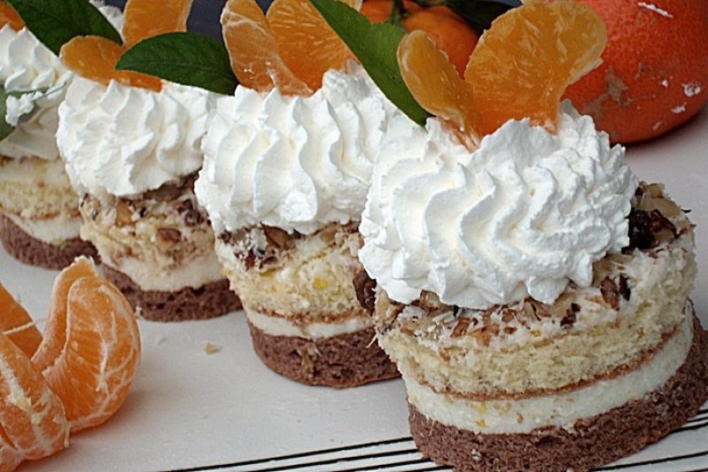 3.Se monteaza prajitura intr-o tava,intr-un cadru metaliuc reglabil ,asezand primul blat de cacao,apoi se toarna trei sferturi din crema de citrice,se vine deasupra cu blatul alb,presand usor cu mana,deasupra se toarna restul de crema oprita de citrice si se presara miezul de nuca prajit si maruntit si obtional fulgi de ciocolata(eu am avut o mana de fulgi de ciocolata alba).Se da la frigider cel putin o ora sa se inatresca,dar ideal ar fi sa stea de seara pana adoua zi,cand se taie prajitura in forma dorita si se decoreaza cu frisca proaspata si feliute de mandarina.