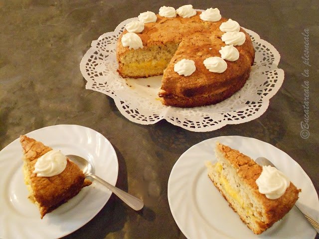 5. Punem compozitia intr-o tava tapetata cu hartie de copt (diametrul 24 cm) si introducem in cuptorul preincalzit 5 min la 200 grade C, apoi reducem temperatura la 180 grade C pana cand trece testul scobitorii.