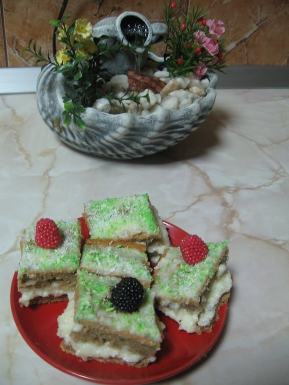 Taiem blatul in doua si si intindem crema de cocos , asezam blatul ramas deasupra si ornam prajitura.