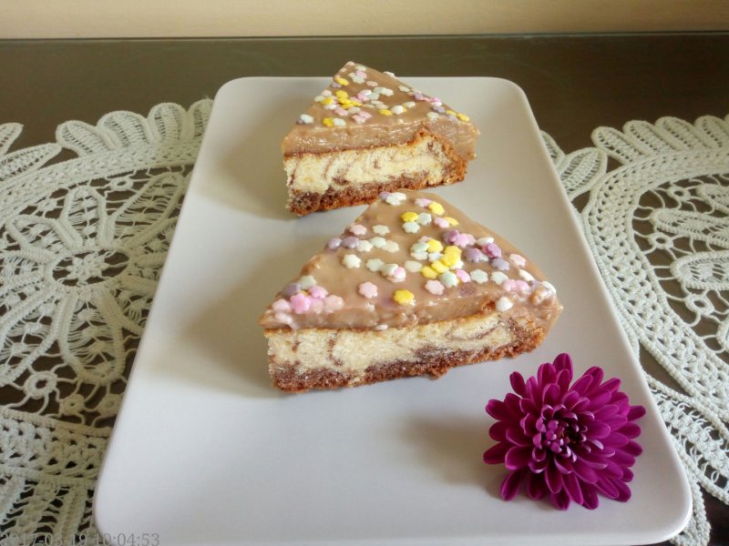 Scoatem forma, lasam sa se raceasca blatul, apoi il punem pe un platou intins si adaugam cercul reglabil. Daca dorim, putem insiropa putin blatul cu suc din compot, apoi turnam usor budinca de cafea pe toata suprafata blatului, apoi decoram cu floricelele de zahar.