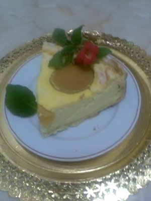 Se scoare aluatul din congelator si se da forma dupa marimea formei de tort. Se aseza cu grija, inclusiv pe marginile laterale ale formei. Se toarna compozitia de branza, iar deasupra se aseaza jumatatile de piersica cu gura in jos. Se baga la cuptorul preincalzit la temperatura de 180 g C timp de 50 - 60 de minute. Timpul de coacere tine de cuptorul fiecaruia. Se scoate, se lasa la racit, apoi se taie.