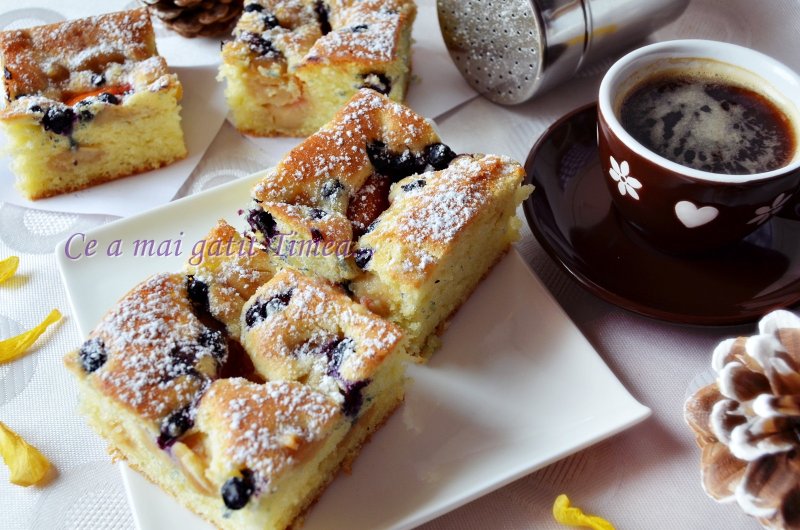 Turnam compozitia intr-o tava tapetata cu hartie de copt sau unsa cu unt si tapetata cu faina. Peste aluat, cu un pos sau o punga gaurita spritam budinca din loc in loc. Peste budinca punem caisele si afinele (sau orice alte fructe doriti). Dam tava la cuptorul preincalzit la 175 de grade timp de 30 de minute plus inca 5 minute cu focul stins si usa deschisa.