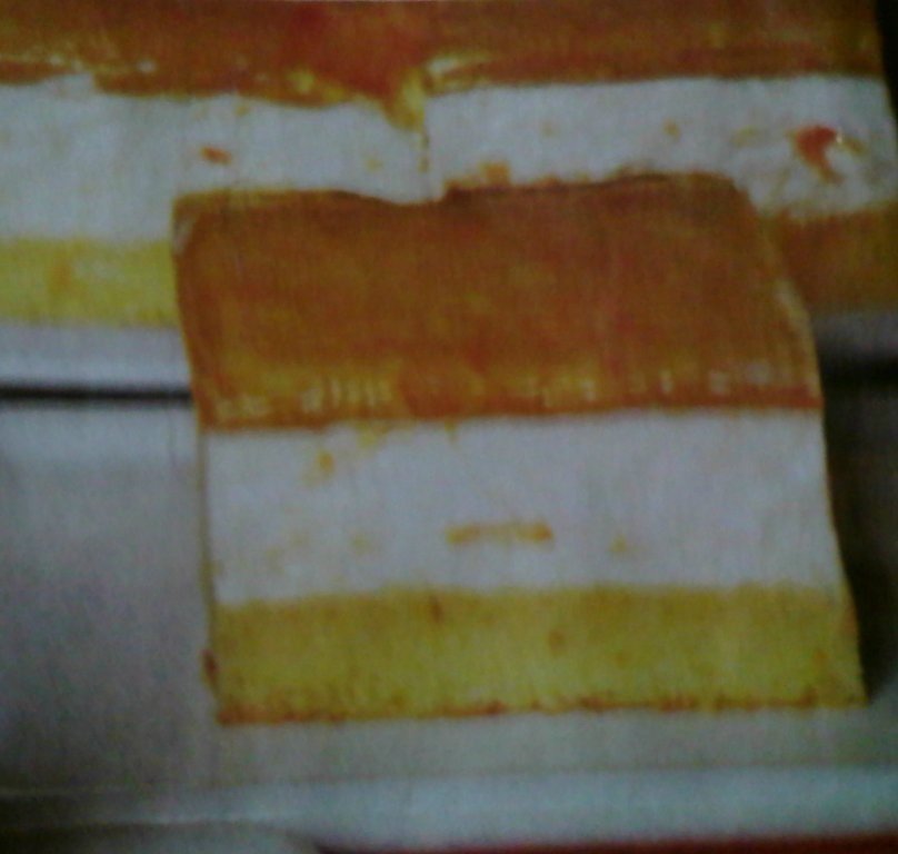 5.Se dizolvă 2 plicuri de gelatină conform indicațiilor de pe ambalaj, se lasă să se răcească, apoi se încorporează ușor în cremă. Compoziția astfel obținută se întinde peste blat și se nivelează cu o spatulă.