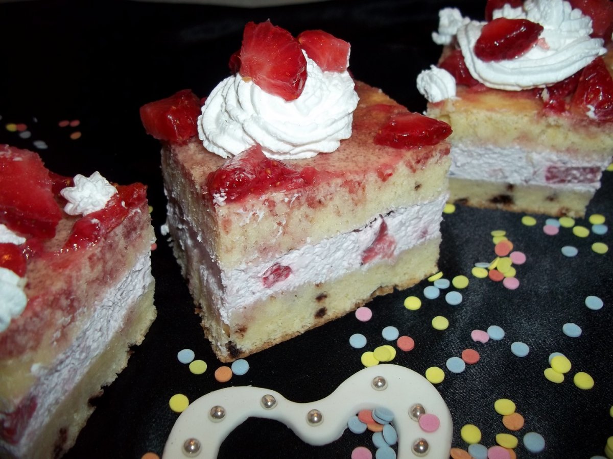 Decor: Se pun capsunile taiete peste blat apoi se decoreaza cu frisca.