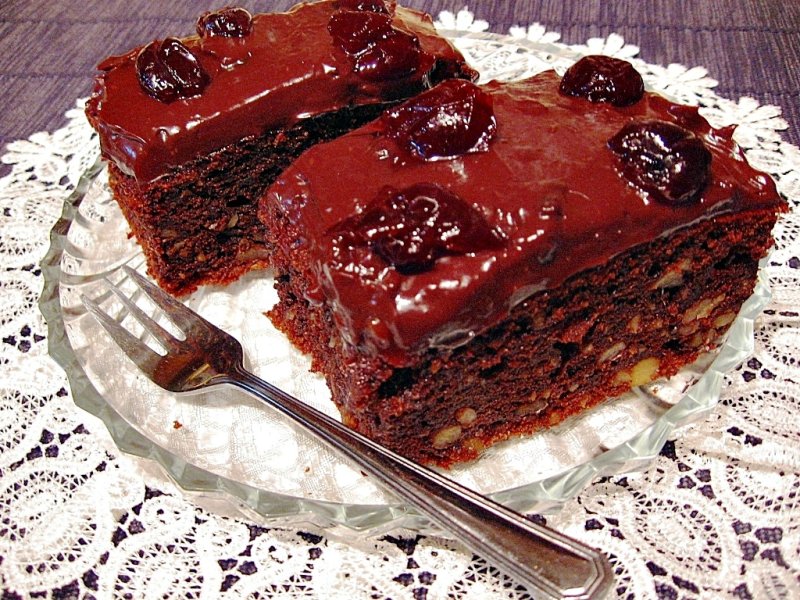 In compozitia de ciocolata oprita, am amestecat visinele din dulceata si am ornat prajitura cand s-a racit.