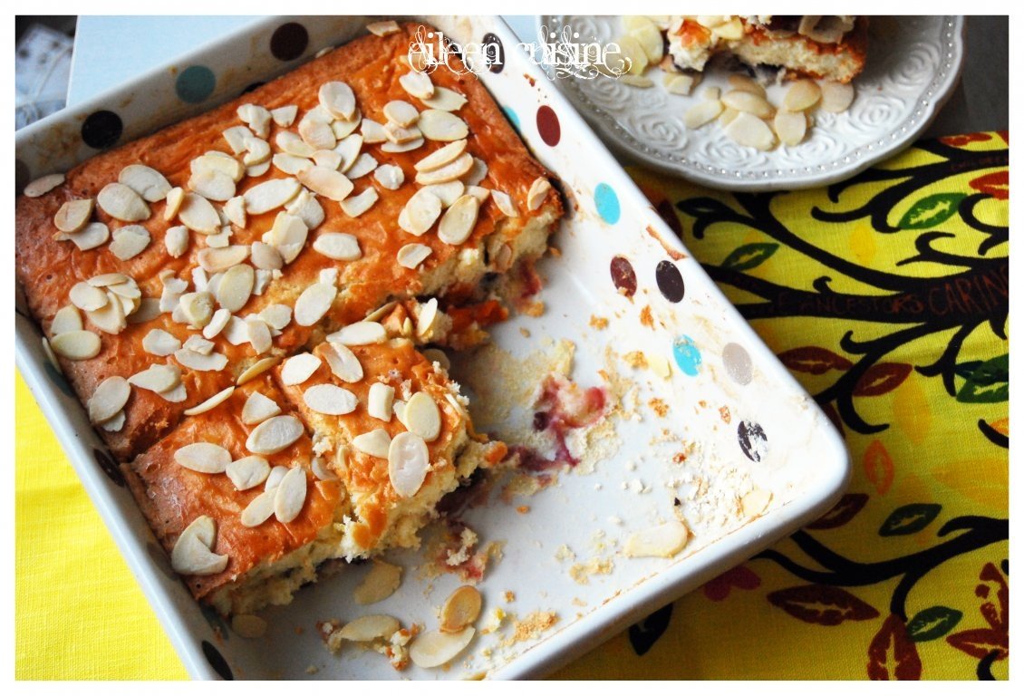 Dati la cuptorul preincins la 160grade pentru 20-30 de minute, pana este aproape gata, facand testul cu scobitoarea. Scoateti din cuptor si ungeti cu un galbenus de ou bine batut apoi presarati cu fulgi de migdale si mai lasati la cuptor 5-10 minute pana prajitura este gata.