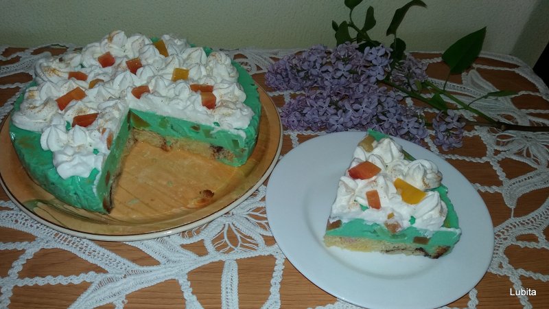 Intr-un vas, se pune laptele, se adauga zaharul si praful de budinca, se amesteca cu telul, apoi se pune vasul pe foc mic, amestecand continuu, pana se ingroasa; cand este gata, se da vasul deoparte, se incorporeaza gelatina hidratata 5 minute, in apa rece si se amesteca pana se dizolva gelatina, apoi se adauga picaturile de colorant. Dupa omogenizare, se adauga fructele, oprind cateva pentru decor, apoi se rastoarna peste feliile de cozonac si se lasa la frigider pana a doua zi.