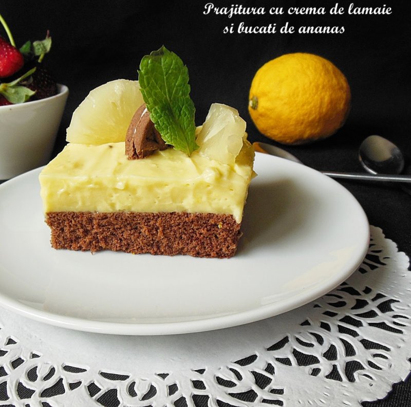 Punem pe fiecare prajitura bucati de ananas, frunzulite de menta si cate jumatate de biscuite.