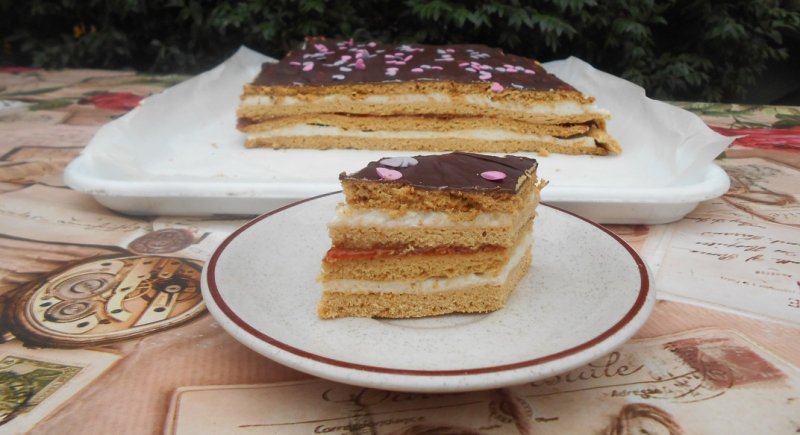 Intr-o tava asezam prima foaie si turnam peste ea jumate din crema asezam deasupra a doua foaie si ungem cu dulceata de caise . Punem a treia foaie si o ungem cu crema ramasa . Asezam deasupra a patra foaie si facem glazura: ciocolata impreuna cu untul o topim pe bain marin sau la microunde.