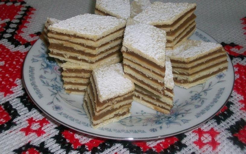 Prajitura se tine la rece o noapte (nu in frigider), presata cu ceva greu, apoi se taie in romburi, nu prea mari. Se poate pudra cu zahar pudra.