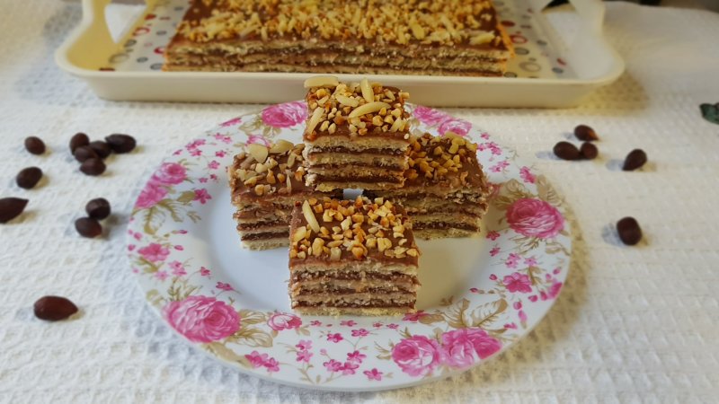 Pe un platou se asaza o foaie. Se unge cu crema, se asaza a doua foaie, se unge cu crema, foaie, iar crema si deasupra ultima foaie care e mai frumoasa. Se unge deasupra cu un strat de crema si se presara alunele tocate. Se lasa pana a doua zi pentru a se unmuia foile dupa care se portioneaza si se serveste.