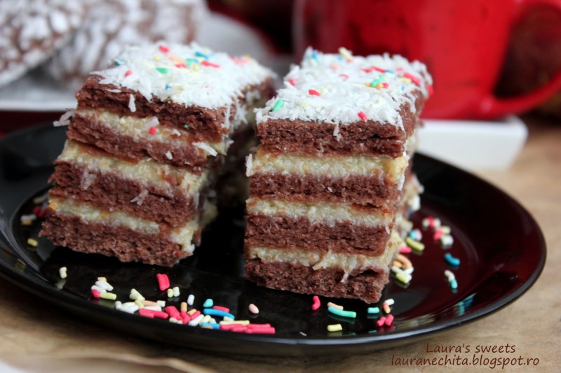 Alternam foile cu crema, incheiem cu ultima foaie peste care presaram un strat generos de nuca de cocos. Asezam o hartie de copt peste prajitura, punem o greutate peste ea si o dam la rece. Trebuie lasata cel putin o zi la fragezit.
