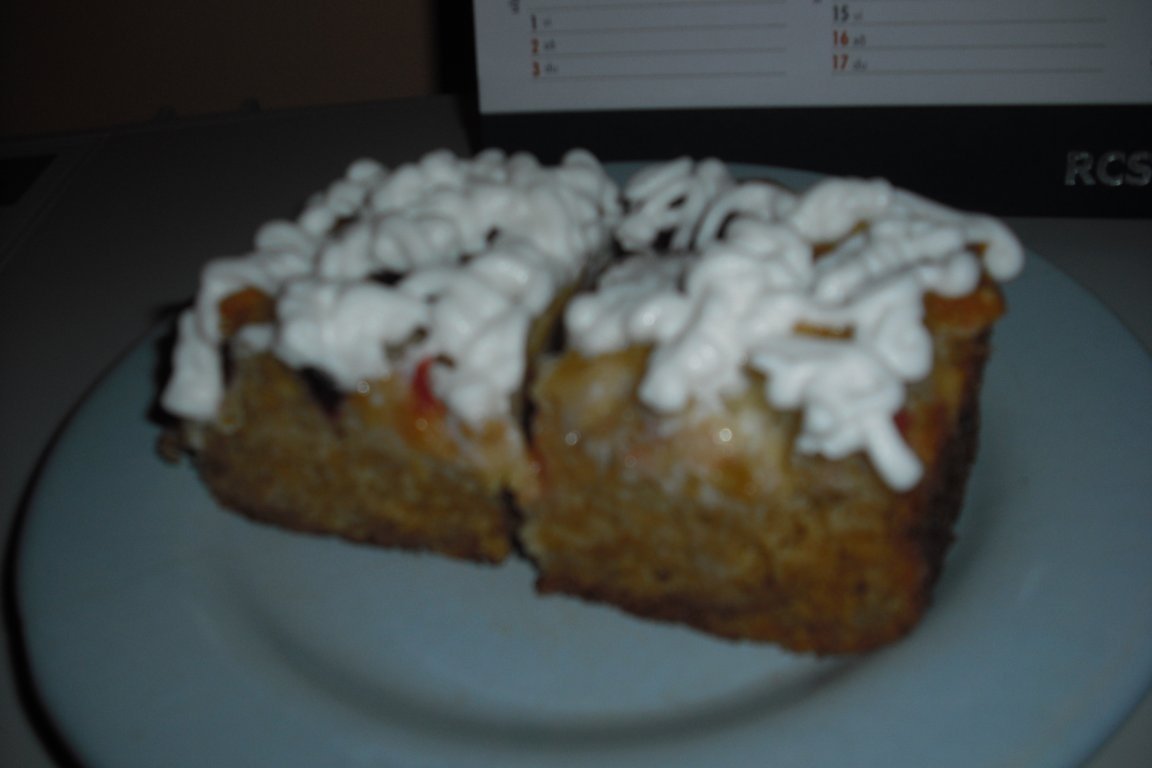 Zaharul si cele 4 oua intregi se freaca 10 minute cu lingura de lemn.Dupa ce s-au spumat si s-a topit zaharul se adauga bicarbonatul amestecat cu faina,uleiul.Se invart de jos in sus cu lingura,incet.Se razuiesc merele si se adauga in compozitie.Se amesteca si apoi se toana compozitia rezultata in tava unsa si tapetata cu hartie de copt.Se storc fructele din compot de suc si se taie bucatele,iar apoi se presar uniform deasupra compozitiei.Se coace la foc mediu cca 45 min.
