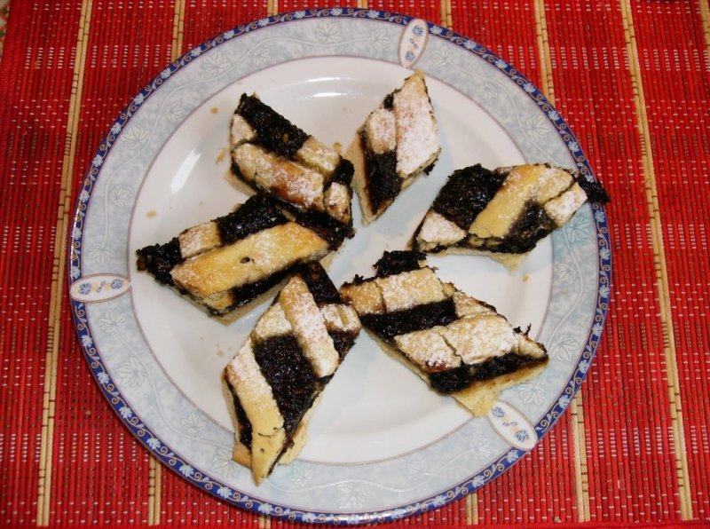 Din aluatul rămas se fac câteva grilaje, care se pun deasupra prăjiturii. Se unge cu gălbenuşul rămas, se presară zahăr vanilat şi se mai introduce la cuptor pentru încă 10 minute.
