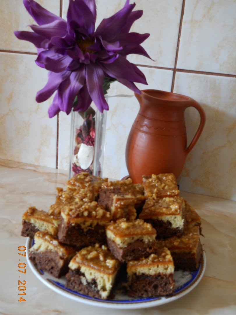 In tava tapetata cu hartie de copt se toarna aluatul fara cacao si se intinde uniform. Peste acesta se intinde usor umplutura (gemul cu nuca si ghimbir ), peste care se intinde aluatul cu cacao.