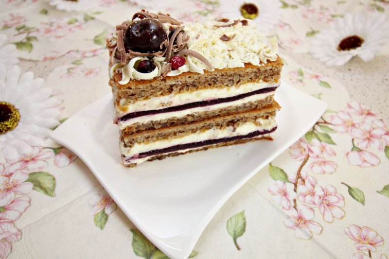 ASAMBLARE: In tava in care am copt foile de blat punem folie alimentara. Asezam prima foaie de blat si o insiropam putin si punem 3-4 linguri de crema de vanilie. Nivelam. Punem jeleul (de la congelator), iar apoi adaugam si restul de crema. Nivelam bine. Insiropam putin si a doua foaie de blat si acoperim cu ultima foaie. Acoperim prajitura cu foaia de prospetime si o lasam in frigider pentru 2-3 ore. Mie mi-au iesit 6 portii mari. Felia de prajitura nu este atat de inalta. In poza eu am pus doua felii una peste alta.
