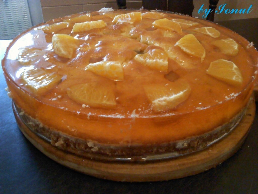 Dupa ce sa racit blatul aflat in tava, se decoreaza cu felii subtiri de portocale, iar cand jeleul incepe sa se inchege, se toarna peste, cu ajutorul unei linguri.