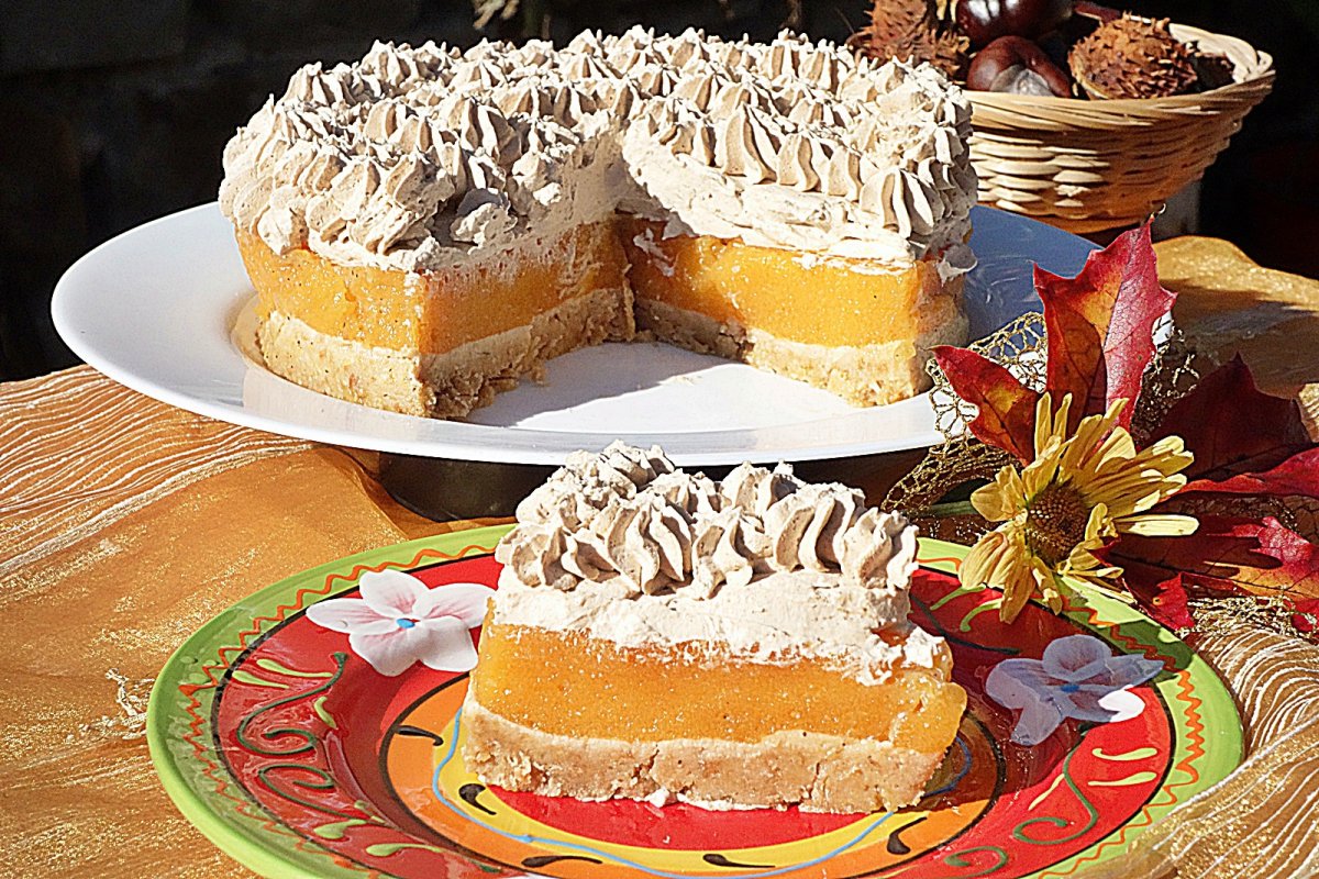 Pregatim piureul de kaki si clementine, dand la blender fructele curatate de coaja. Adaugam in piure si gelatina deshidrata in 100 ml apa rece, apoi topita (nu fiarta) la bain marie. Se toarna peste blatul de biscuiti si se lasa 2 ore sa se intareasca, la rece dupa care se scoate si se decoreaza cu frisca lichida mixata pana se intareste si amestecata cu pireul de castane.
