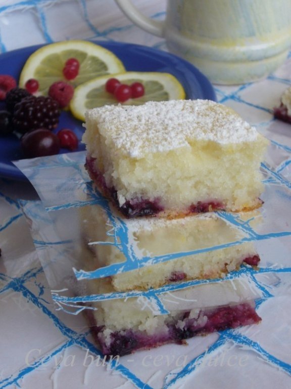 Eu am avut fructe de padure congelate, bineinteles decongelati inainte de a pregati prajitura, apoi amestecati cu o paleta in compozitie. Turnam compozitia intr-o tava cu harti de copt si coacem la foc potrivit pana trece testul scobitorii. Dupa ce s-a copt se lasa la racit si se pudreaza cu zahar. Taiati doar dupa racire!