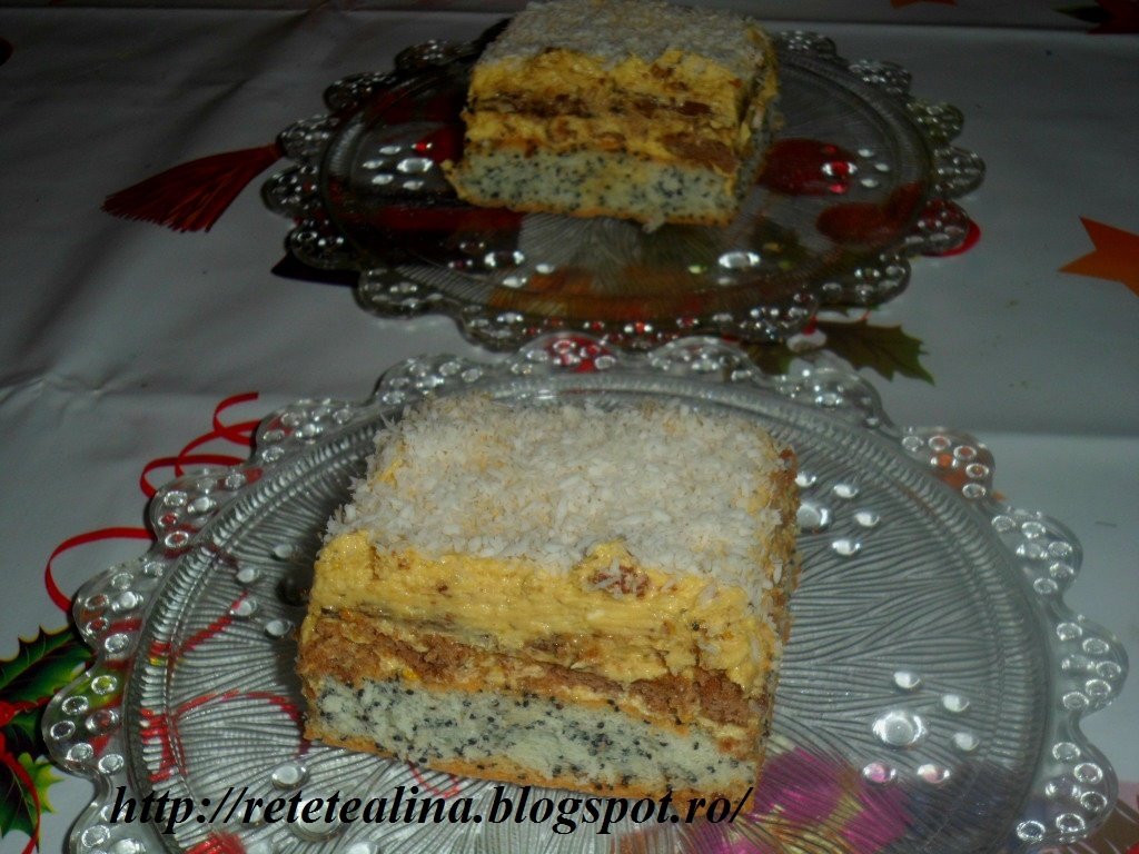 Albusurile se bat spuma tare si se pune pe rand zaharul. Apoi adaugam macul, nuca de cocos si faina pe care am amestecat-o cu praful de copt, amestecam cu o lingura de lemn de jos in sus pana se omogenizeaza toate. Punem blatul intr-o tava mare tapetata cu hartie de copt si introducem tava in cuptor si se lasa la foc mic pana se rumeneste usor deasupra.
