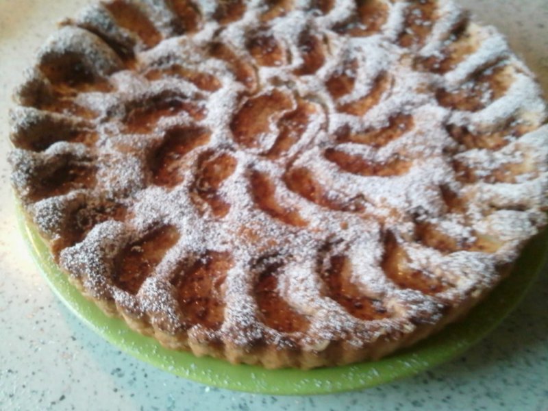 Merele (3- 4 mere) curatate de coaja si fara seminte se taie felii se aseaza in tava, peste compozitie, de jur imprejur, apoi se presara o lingura de zahar si scortisoara.