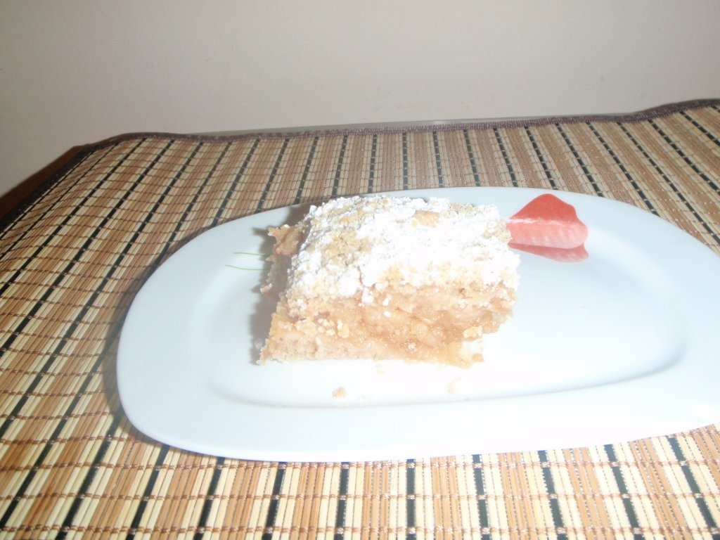Intr-o tava unsa cu unt se asaza framatand in palme jumatate de cantitate din aluat,se adauga umplutura si se pune cealalta jumatate de aluat pe deasupra merelor.