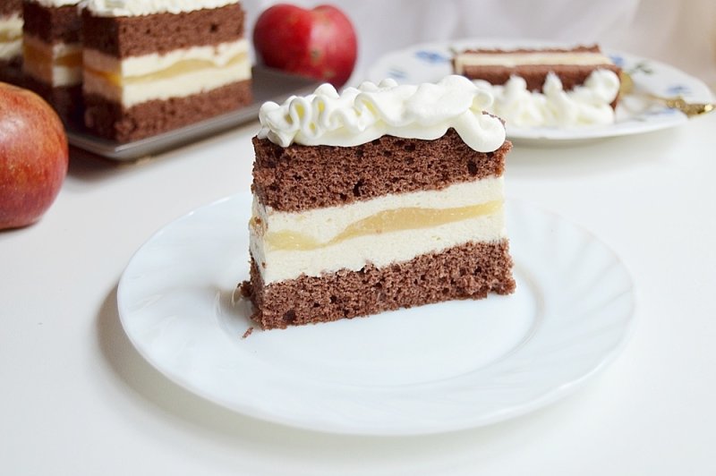 Prepari a doua transa de crema de mere, scoti apoi tava cu prajitura de la frigider si torni crema de mere, o intinzi bine si pui cealalta felie de blat deasupra (nu uita sa o insiropezi dupa ce ai pus-o) si introdu in frigider pentru minumum 5 ore .