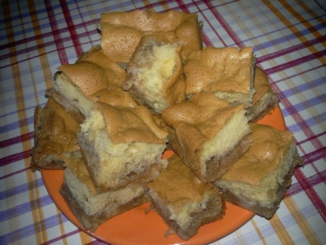 Mixam bine pana obtinem un aluat putin mai gros ca la chec. Intr-o tava (mai mica) am tapetat-o cu hartie de copt, peste, am turnat jumatate din compozitia de aluat, dam la cuptor pentru cca. 10 minute, apoi scoatem tava si punem umplutura de mere, o intindem frumos, iar deasupra cealalta jumatate din compozitia de aluat. Dam totul la cuptor pana se rumeneste usor deasupra.
