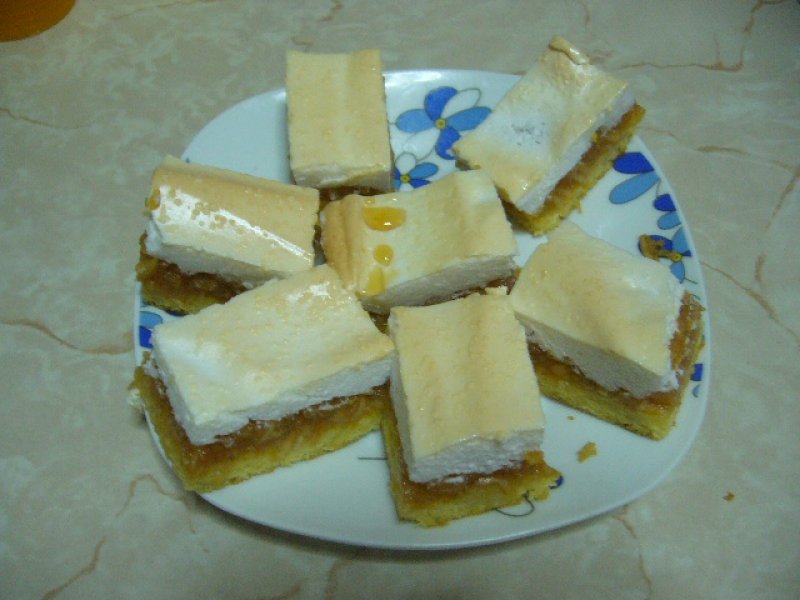 Pentru blat se mixeaza galbenusurile cu zaharul apoi se adauga uleiul in fir ca la maioneza pana devine o crema spumoasa.Apoi se adauga celelalte ingrediente.Compozitia se pune intr-o tava unsa cu ulei si tapetata cu faina si se da la cuptor cam 15-20 minute la foc potrivit.Intre timp merele se curata de coaja se dau pe razatoarea mare si se calesc cu zaharul si zaharul vanilat 5 minute pe foc pentru a scadea sosul care-l lasa.Albusurile se bat spuma tare cu mixerul si cand se tine de tel se adauga zaharul.Peste blatul copt pe jumatate se pun merele si bezeaua se intinde peste mere si se mai lasa la cuptor cam. 10-15 minute pana bezeaua capata o culoare maronie deschisa.