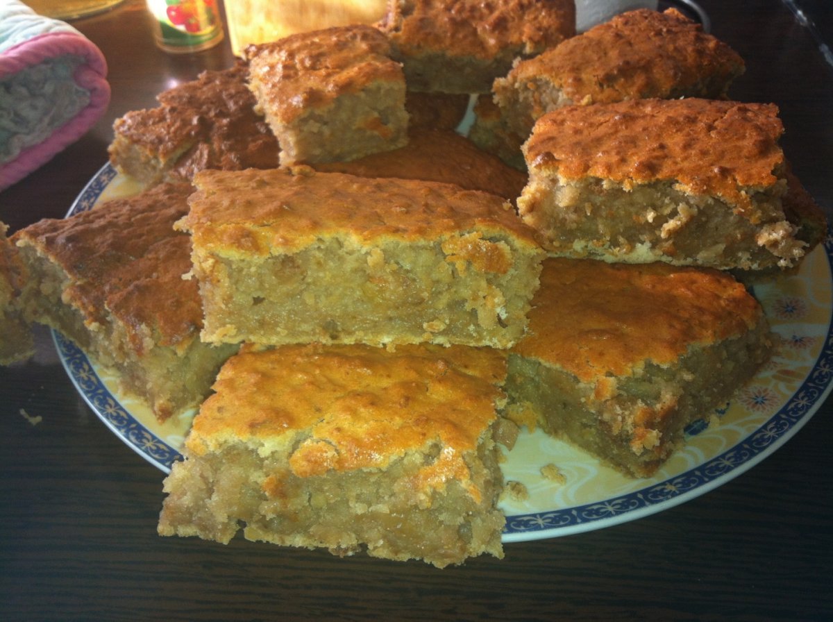 Se curata merele de coaja si se dau pe razatoare, se adauga ouale batute, zaharul pudra, uleiul, faina cu praful de copt si nucile. Dupa fiecare in parte se amesteca. Se unge tava cu unt si se tapeteaza cu faina. Se coace la foc mic 30-40 min.
