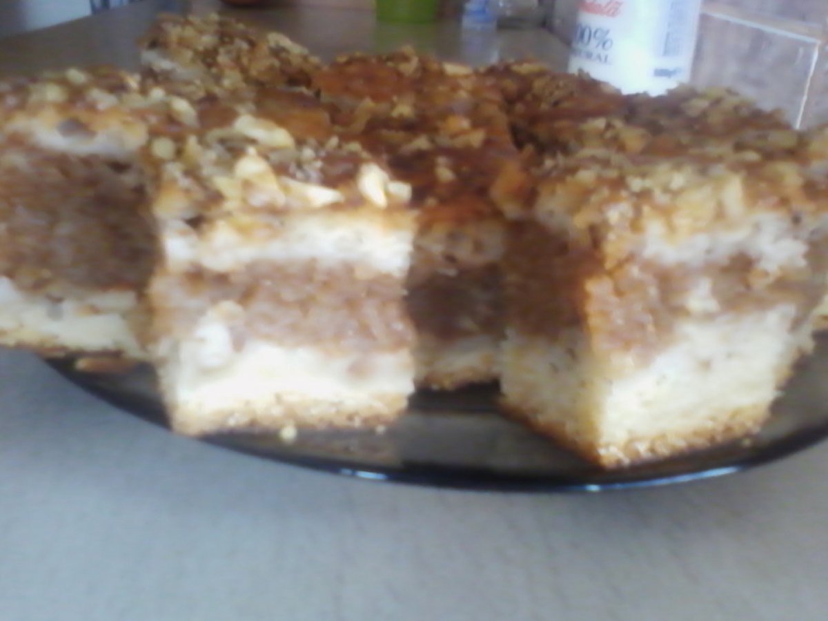 Se lasa 15 minute la copt dupa care se pun merele peste blatul semicopt si se imbraca cu restul de aluat si se presara si nuca ramasa. Se lasa pana se rumeneste si se testeaza cu scobitoare daca s-a copt. Se lasa la racit si se taie dupa preferinta.