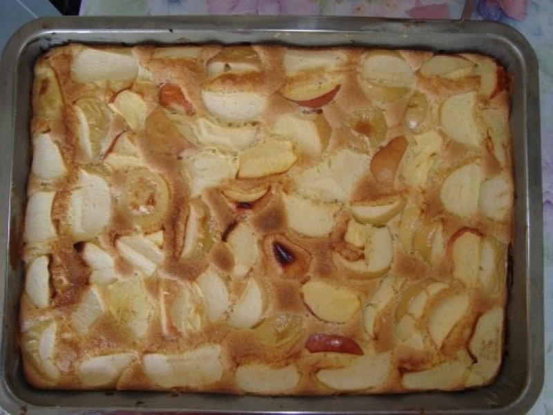 Compozitia rezultata se pune intr-o tava unsa cu ulei si tapetata cu faina, iar pe deasupra se aseaza feliile de mere. Se da la cuptorul 25 minute.