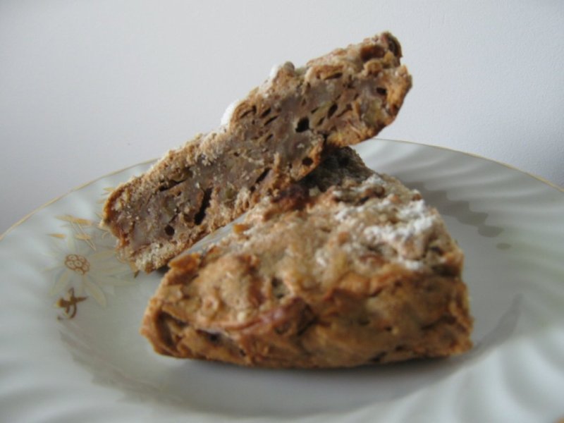 Se amesteca untul cu zahar, pana ce acesta din urma se topeste. Se incorporeaza ouale, unul cate unul. Se adauga si faina, merele scurse de zeama, nucile, si cele 3 condimente. Se pudreaza cu zaharul pudra vanilat (la cuptor va forma o crusta crocanta delicioasa). Se coace la cuptor timp de 1 ora la 180 grade. Eu am copt intr-o tava rotunda cu diametrul de 26 centimentri.