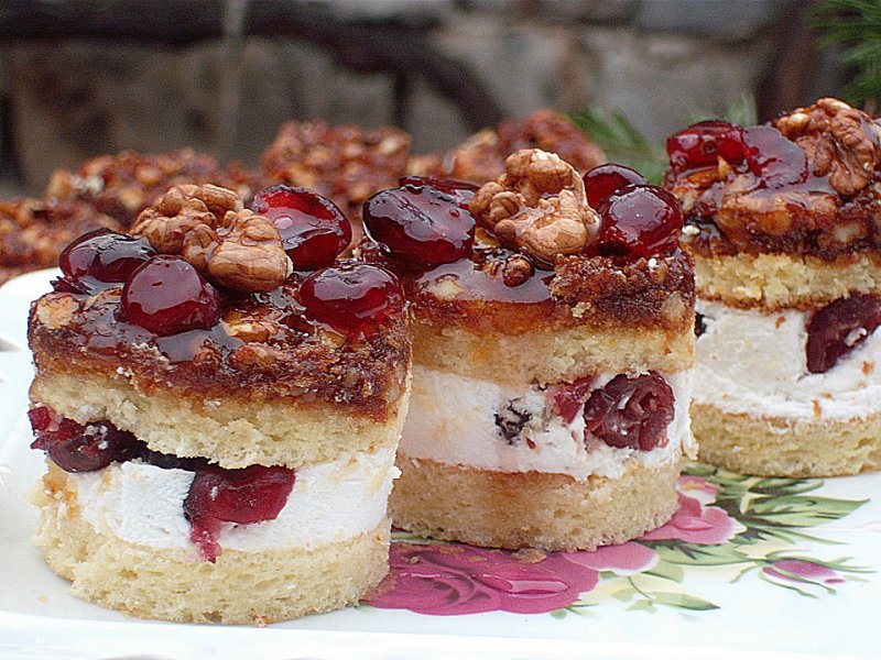 Se caramelizeaza 150 g zahar,pana devine moro deschis apoi adaugam nucile maruntite in el.Turnam in fir subtire si oul batut ca la omleta,amestecand repede.Se toarna fierbinte deasupra ultimului blt al prajiturii si se niveleaza,presand usor,cu o lingura.Dam prajitura cel purin 2 ore la rece inainte de a o taia in forma dorita.