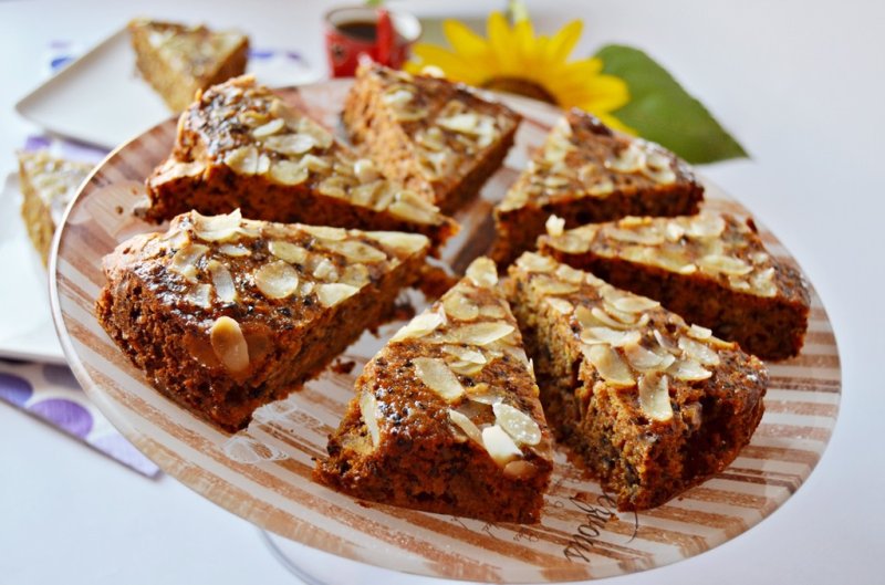 Punem hartie de copt in cuva de ceramica si turnam compozitia in ea. Presaram desupra fulgi de migdale si punem capacul.