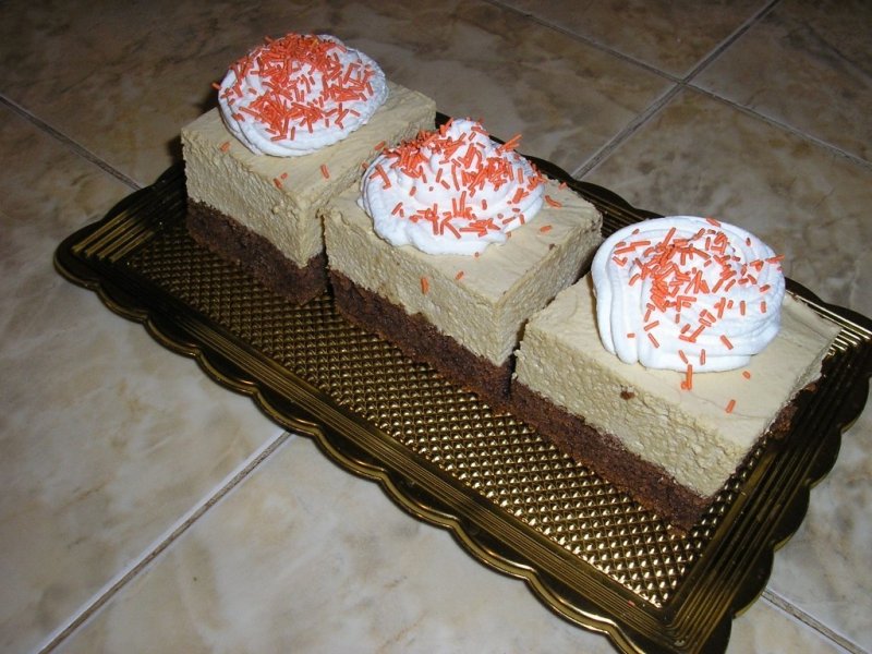 Pentru blat: se bat albusurile spuma cu apa si cate putin zahar. Galbenusurile frecate cu ulei se toarna in fir in compozitia de albusuri. La urma faina amestecata cu cacao.Se pune in tava de 24/24 cm cu hartie de copt,la cuptorul preincalzit la 180 de grade pt cca 30 min.