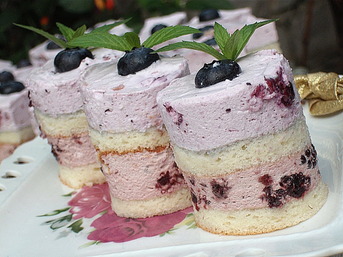 Se mixeaza frisca pana se intareste .Se mixeaza branza cu smantana pana obtinem o crema pufoasa acare se amesteca cxu frisca batuta.Se imparte in 2 cantitati egale.Se aseaza prima jumatate de blat intr-o forma dreptunghiulara reglabila apoi se toarna deasupra prima parte de amestec de frisca in care am incorporat dulceata de mure si un plic de gelatina hidratat in 100 ml apa rece si apoi topit(nu fiert)la bain marin.Deasupra se aseaza a 2 a bucata de blat,se preseaza usor cu mana si se toarna cealalta parte de crema amestecata cu dulceata de afine si gelatina topita.Se da la rece 3 ore inante de ataia prajitura.