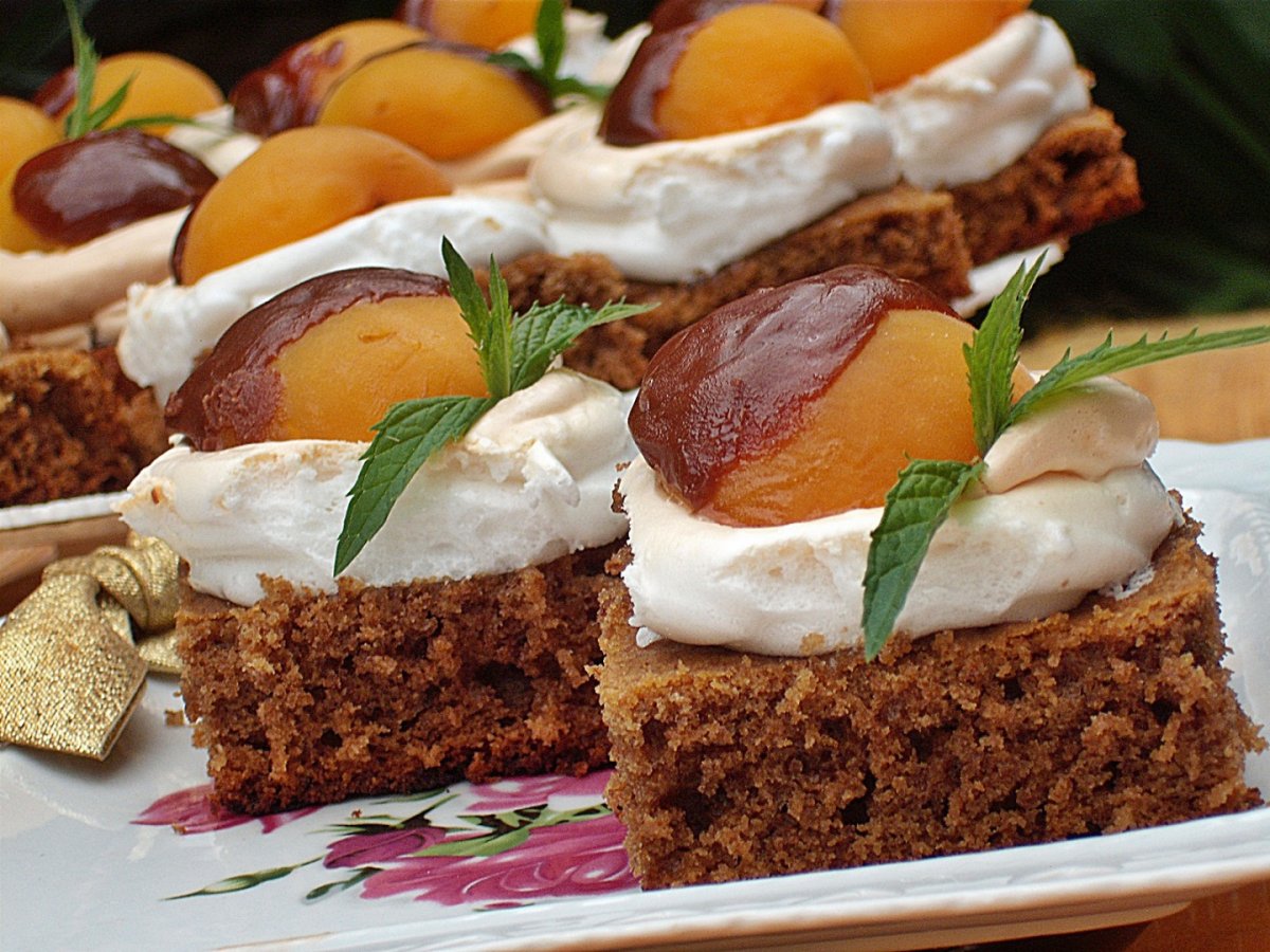 Se scoate blatul din cuptor,se traseazaa cu lama unui cutit niste patrate si apoi in fiecare se face cu posul cate un cuib din bezea.Se mai da la cuptor inca 2 minute,la foc mic pana se rumeneste un pic bezeaua.Se scoate si se taie in patrate iar dupa ce s-au racit se pune in fiecare cuib de bezea cate o jumatate de caisa din compot,scurse bine apoi trase in ciocolata.