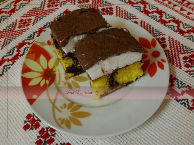 Se toarna o parte din amestec intr-un castronel, adaugam o lingurita de cacao si amestecam bine. Turnam din amestecul alb intr-o tava (in care am pus foaie de copt), apoi turnam si din amestecul negru si cream un model cu ajutorul unei scobitori, dupa inspiratie. Se da la cuptorul incins pana se face auriu aluatul (asta inseamna cam 15-20 de minute), la foc mediu.